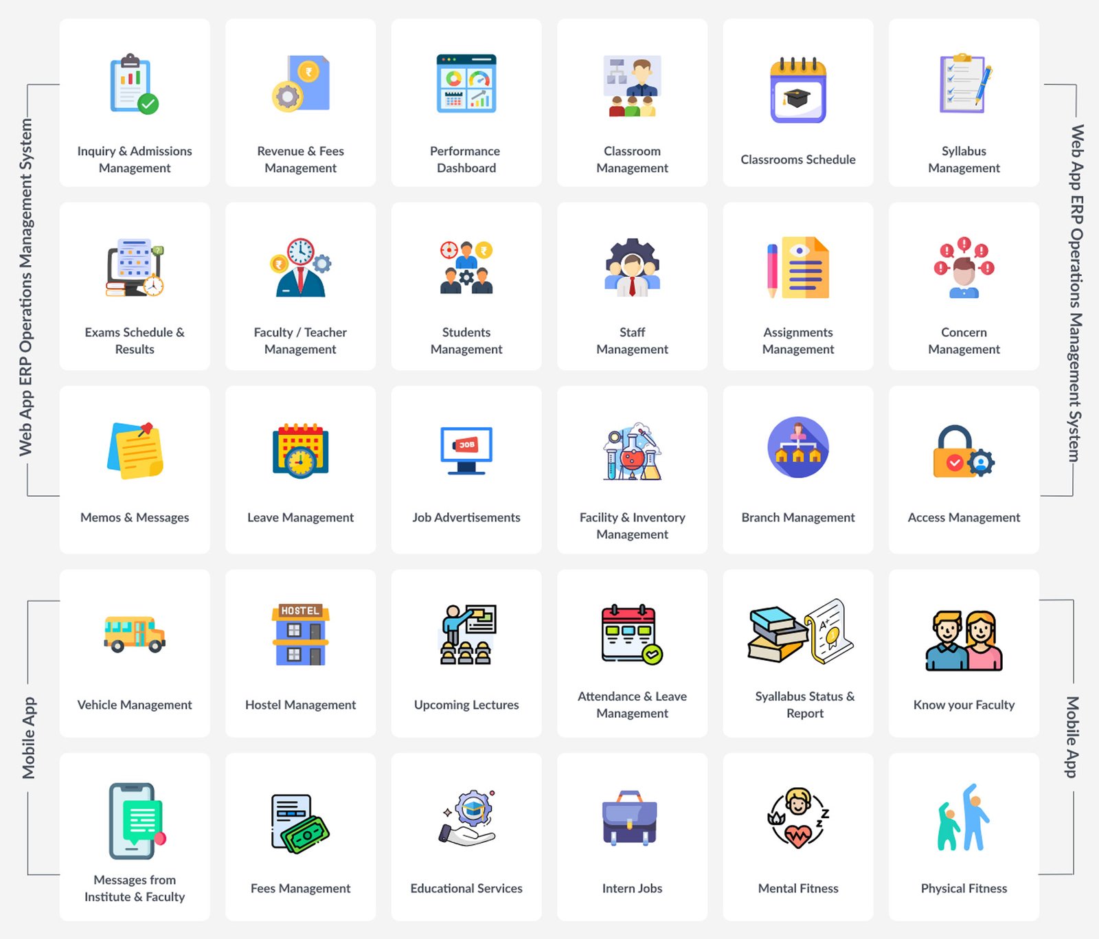 FIRST educational ERP system offering cutting-edge technology integrated with a mobile app for real-time data sync for faculty, students, and parents.
